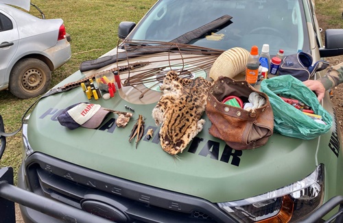 Em conversa com a responsável pelo imóvel, os militares observaram carcaças de animais silvestres como veado, tatu, o couro de uma jaguatirica e de um quati. As partes estavam pendurados nas paredes da casa. A responsável franqueou a entrada dos policiais os quais localizaram em um cômodo da casa munições de diversos calibres, alem de pólvora, espoletas, chumbos e outros equipamentos.