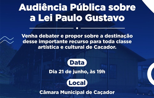 A Prefeitura de Caçador, através da Secretaria de Cultura, Esporte e Lazer, em parceria com a AMARP, realiza audiência pública, presencial, sobre a Lei Paulo Gustavo, que irá beneficiar diversos profissionais da cultura de Caçador.