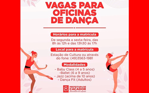 A Prefeitura de Caçador, através da Secretaria de Cultura, Esporte e Lazer, abre vagas para oficinas gratuitas de danças. As oficinas variam entre baby class; ballet; jazz e dança fit, mais conhecida como zumba.