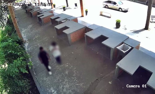 Pelas imagens, é possível verificar que os dois circulam pela área da Feira durante o dia e, quando passam pelos banheiros, chutam e quebram a porta, que estava fechada.