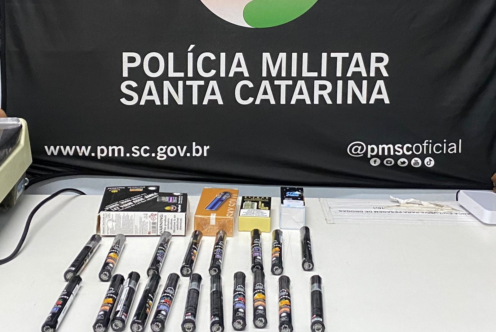Segundo a PM, foram apreendidos 19 cigarros eletrônicos de marcas diversas, além de outros apetrechos importados de forma irregular.