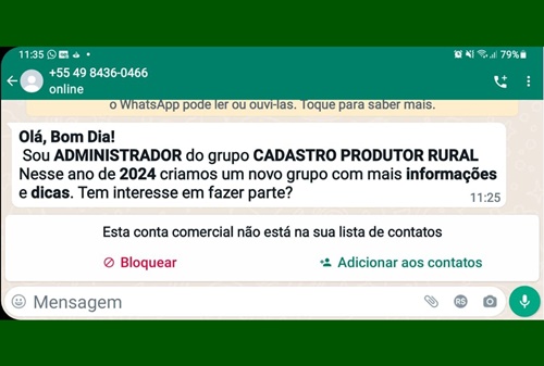 Está circulando no WhatsApp um convite para um grupo fake, com nome de Cadastro Produtor Rural. Na mensagem, é afirmado que foi criado um novo grupo com mais informações e dicas para o ano de 2024.
