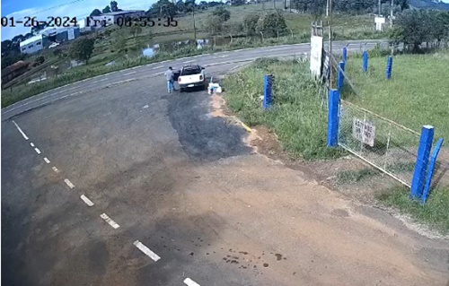 Câmeras de segurança flagraram um homem jogando lixo em uma área proibida, no portão 2 do Parque das Araucárias, em Caçador. Tranquilamente, ele chega em uma Strada branca, desce do veículo, tira latas de tinta e restos de equipamentos de pintura e joga no local.