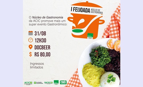 Fazendo parte do Mês dos Núcleos, o Núcleo de Gastronomia da Associação Empresarial de Caçador (Acic) promove dia 31 de agosto a 1ª Feijoada do Núcleo de Gastronomia, na sede da Doc Beer com o almoço sendo servido a partir das 12h30. Os ingressos ainda estão disponíveis.