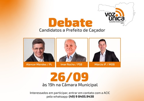 Nesta quinta-feira, 26 de setembro, a Associação Empresarial de Caçador (ACIC) promove seu debate com os candidatos a prefeito de Caçador, Alencar Mendes (PL), Imar Rocha (PSB) e Marcio JF (MDB). O encontro inicia às 19h na Câmara de Vereadores e terá transmissão ao vivo pelo youtube: /aciccacador.