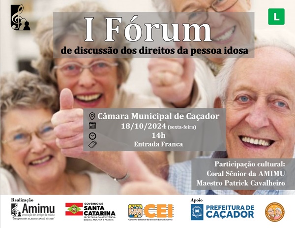 Na próxima sexta-feira, dia 18, acontecerá na Câmara Municipal de Vereadores de Caçador, o I Fórum de Discussão dos Direitos da Pessoa Idosa. O evento tem por objetivo debater e fortalecer as políticas voltadas à população idosa no município. A programação terá início às 14h, com a abertura, seguida de uma apresentação do Coral Sênior da Associação dos Amigos da Música (AMIMU). Todos os idosos do município estão convidados a participarem.