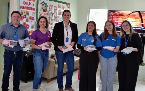 Participaram da entrega: Carlos Schuller, coordenador de Educação Profissional do SENAI Caçador, Taylane Ramos, interlocutora de Responsabilidade Social, Luciane Ribeiro, professora de Corte e Costura e duas alunas que representaram a turma de Aprendizagem Industrial de Costura.