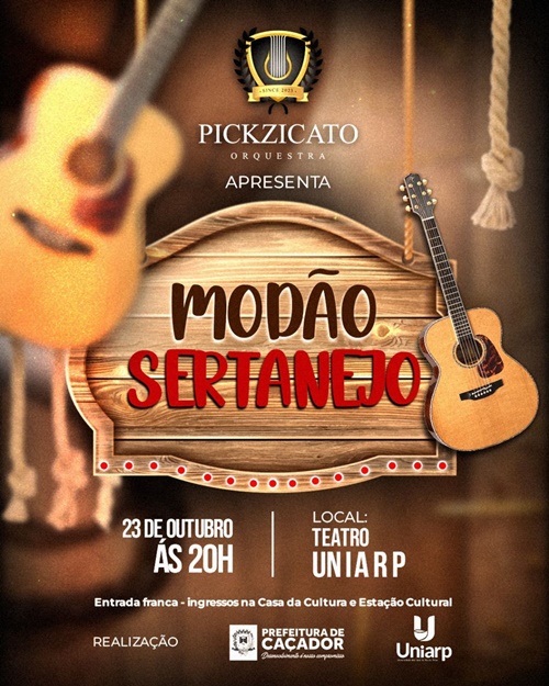 A Pickzicato Orquestra, da Prefeitura de Caçador, realiza o espetáculo gratuito “Modão Sertanejo”, que irá relembrar o autêntico som raiz sertanejo, na próxima quarta-feira, 23 de outubro, às 20h, no Teatro UNIARP.