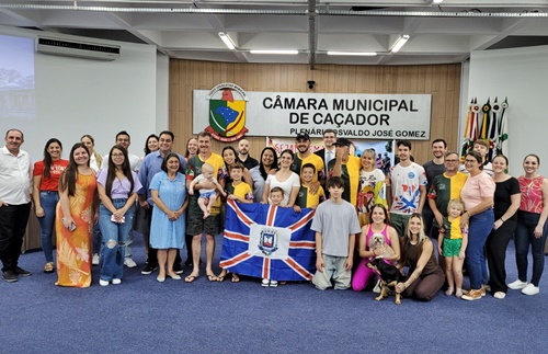 Depois de percorrer 800 quilômetros de bicicleta, levando a bandeira de Caçador para vários Municípios de Santa Catarina, os ciclistas caçadorenses Johny Marcos, Mauro de Paris e Maicon Coelho, ao lado do colega Edson Luiz Otto, de Rio das Antas, foram recepcionados na tarde desta quinta-feira (23) na Câmara de Vereadores.