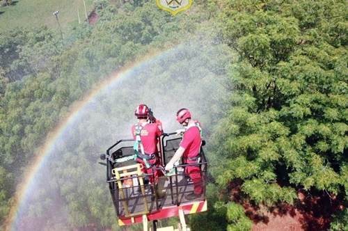 Logo após o treinamento de operação da viatura, os bombeiros participantes realizaram os treinamentos de posicionamento e operação do sistema em telhados e edifícios.