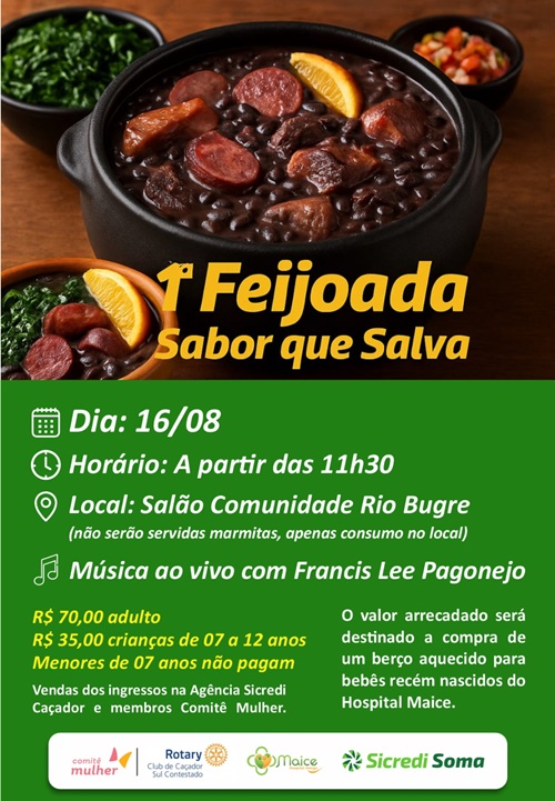 O Comitê Mulher, Rotary Club de Caçador Sul Contestado, Sicredi e o Hospital Maice realizam dia 16 de agosto, às 11h30, uma feijoada beneficente, no Salão da comunidade da linha Rio Bugre. Todo o valor arrecado será para a compra de um berço aquecido para os recém-nascidos do Hospital Maice.