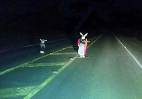 Moradores de Rodeiozinho, em Papanduva, tiveram uma surpresa inusitada na noite de segunda-feira (7), ao se depararem com dois coelhos de enfeite segurando cruzes de madeira às margens da SC-477. As figuras foram posicionadas de forma visível e rapidamente chamaram a atenção de quem passava pelo local, gerando interpretações que vão desde brincadeiras de mau gosto até possíveis manifestações artísticas ou religiosas.