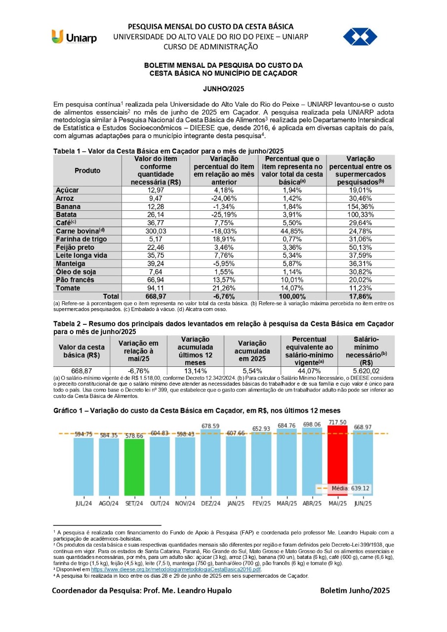 Em pesquisa contínua realizada pelo curso de Administração da Universidade Alto Vale do Rio do Peixe (UNIARP) levantou-se o custo de alimentos essenciais no mês de junho em Caçador. Para o mês de junho o custo da Cesta Básica foi de R$ 668,97, representando uma queda de 6,76% em relação ao mês anterior, bem como uma parcela de 44,07% do salário-mínimo vigente, tendo como salário-mínimo necessário, segundo metodologia do DIEESE, o valor de R$ 5.620,02 para atender as necessidades de uma família composta por dois adultos e duas crianças.