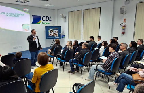 A CDL Caçador promoveu na noite desta quinta-feira (30) mais uma palestra voltada à capacitação e ao fortalecimento do comércio local. O tema da vez foi “A Arte da Venda através do Encantamento”, ministrada por Edinei Menegon, que trouxe muita energia e conteúdo prático para empresários, associados e trabalhadores do setor.