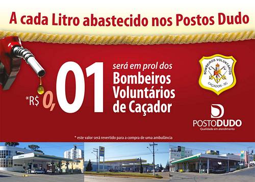 Foi lançada na tarde desta sexta-feira, 9, em Caçador, a Campanha entre os Postos Dudo e os Bombeiros Voluntários. A cada litro de álcool ou gasolina abastecido nos postos Dudo; da Avenida Barão do Rio Branco, próximo a Praça Nossa Senhora aparecida; Altamiro Guimarães, próximo a ponte e Rodovia Engenheiro Lourenço Faoro próximo ao PET, 0,01 (um) centavo será destinado para a Corporação.