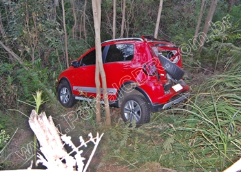 Com o impacto, o Cross Fox ficou sem controle e rodou na pista derrapando por mais de 30 metros até que caiu em um barranco ás margens da rodovia. Duas pessoas que estava n o carro ficaram feridas. Andreia Marins Veronese, 41 anos, apresentou suspeita de fratura no nariz e Enzo Marin Veronese, 12 anos, teve ferimentos na cabeça. Ambos foram conduzidos ao Pronto Socorro do Hospital Maicé, em Caçador.
