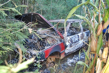O carro registrado em nome de Antônio Ferreira Wilke estava incendiado em meio a uma plantação de milho em um terreno a cerca de dois quilômetros da entrada de Estação Experimental da Epagri, ás margens de uma estrada vicinal da localidade da Linha Caixa D’água, interior de Caçador.