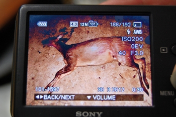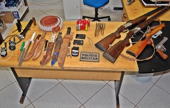 Nos carros estavam duas espingardas calibre 12, com 33 cartuchos intactos; uma espingarda artesanal e um revólver calibre 38, com 34 munições intactas e 12 deflagradas; quatro facas e dois facões; três lanternas; dois rádios comunicadores e duas câmeras digitais e um celular. Nas câmeras inclusive havia fotos do animal morto ainda antes de ser carneado.