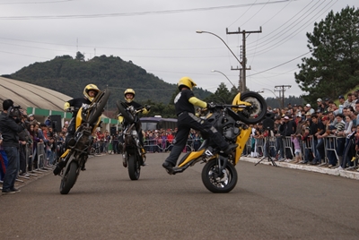 E durante à tarde, a comunidade se fez presente em grande número, em frente ao Ginásio Municipal, para acompanhar a apresentação das manobras radicais em motocicletas. A equipe Whelling 360° animou com um espetáculo emocionante. Foram cinco pilotos e cinco motos, com cilindradas distintas, que agitaram a tarde de domingo. O diferencial da equipe se dá pela variedade nas apresentações. São ações com arco Maria-cambota, salto em arco de fogo, “borrachão”, estouro de pneus, bombas pirotécnicas, lança-chamas, atividades com o público, e muita aceleração, tanto nas motos como no coração das pessoas.