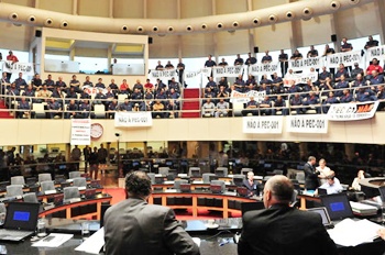 A presença de bombeiros, tanto militares quanto voluntários, na Assembleia Legislativa, já era flagrante nas primeiras horas da manhã. E não foram apenas os bombeiros que se fizeram presentes, na expectativa da votação da PEC de autoria da Mesa e que acrescenta parágrafo único ao artigo 112 da Constituição do Estado de Santa Catarina. Prefeitos, vereadores, representantes de associações comerciais e industriais e de outros importantes segmentos da sociedade catarinense acompanharam de perto o debate e a votação.