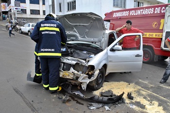 Um acidente de trânsito deixou duas pessoas feridas na tarde desta segunda-feira, 28 de maio. A colisão aconteceu no cruzamento da Avenida Barão do Rio Branco com a Rua Altamiro Guimarães, no Centro de Caçador e envolveu o VW Gol, placas MDU-2595 de Caçador que se deslocava pela Rua Altamiro Guimarães sentido Ginásio das Bochas e o caminhão VW 12-140, placas AHF-3716 de Joaçaba, descia a Avenida Barão do Rio Branco sentido ponte.