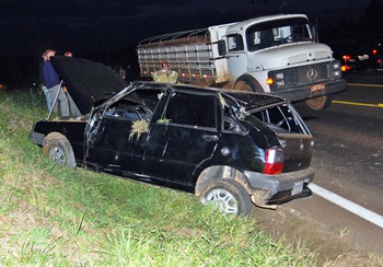 Após bater no para-choque no caminhão, o Uno ficou sem controle, rodou na pista e acabou capotando indo parar fora da pista.