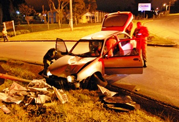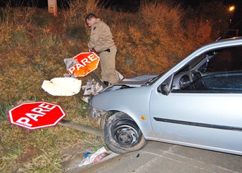 O fato aconteceu por volta das 23h30min, desta terça quando Vanderlei Dias, de 32 anos, se conduzia com o Ford Fiesta, placas DFG-0089 de Caçador, pela Rodovia Honorino Moro sentido Parque das Araucárias/Trevo de Rio das Antas. Após perder o controle da direção o carro subiu nos canteiros do trevo, quase colidiu em outro veículo, derrubou três placas de sinalização de trânsito e só parou quando atingiu a canaleta ás margens da pista.