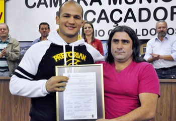 A Câmara Municipal de Caçador promoveu uma sessão especial na manhã desta sexta-feira (29) para entregar cópia do Projeto de Decreto Legislativo nº 011/12, que concede o Título de Cidadão Benemérito ao lutador Junior Cigano dos Santos.