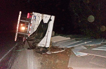 Um caminhão carregado de chapas de MDF tombou na noite desta segunda-feira, no km 24 da Rodovia SC 451. O acidente aconteceu por volta das 20hrs, próximo a Floresta Nacional do Ibama, no Distrito de Taquara Verde.