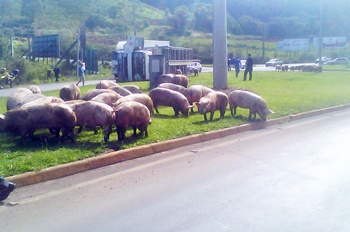 Os animais que faziam parte da carga ficaram espalhados ás margens da via e outro caminhão foi acionado para fazer a remoção dos suínos.
