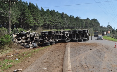 Na manhã desta terça-feira, 16, uma carreta tombou na SC 302, saída para Lebon Régis. O veículo era conduzido por Claudio Schabal, de 27 anos, que estava sozinho na Scania 12G 360, placas LXI-3071 de Itajaí e não se feriu.