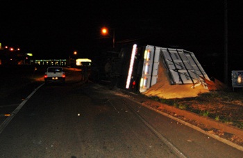 Um caminhão caçamba, com placas de Pinhalzinho-SC, carregado de serragem tombou na madrugada desta quinta-feira, dia 24, no Trevo da Perimetral Norte de Caçador, proximidades do Posto Esplanada. Suspeita-se que um problema mecânico tenha causado o acidente.