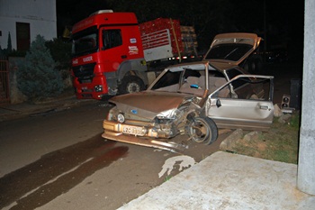 Um veículo de passeio ficou parcialmente destruído na madrugada deste domingo, dia 27, depois de se chocar contra um caminhão estacionado na Rua Ivo Raisel, Bairro Tabajara. Apesar da força da batida o motorista, Claudemir de Aranha, 31 anos, não se feriu.