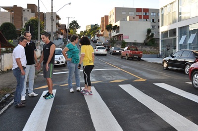 Acompanhados da secretária de Infraestrutura, Denise Chiarello, o prefeito e o diretor da Dittesc estiveram avaliando a obra feita próxima a uma academia, onde também conversaram com o proprietário do estabelecimento, Rodrigo Schmitz, que aprovou a faixa elevada, pois trouxe mais segurança aos cidadãos.