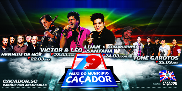 Os 79 anos de Caçador a serem comemorados neste mês de março reservam grandes atrações artísticas para as festividades no Parque das Araucárias durante os dias 22, 23, 24 e 25. Nesta quarta-feira (6) foram conhecidos os shows nacionais que irão abrilhantar a festa. Na sexta-feira (22) após a abertura oficial apresenta-se a banda Nenhum de Nós. No sábado (23) a dupla de sucesso Vitor e Léo sobe ao palco em Caçador. No domingo (24) dose dupla na Festa do Município, com o reggae de Armandinho e o fenômeno do sertanejo universitário Luan Santana. No dia 25, aniversário do município, a festividades se encerram com outro show nacional, Tchê Garotos.