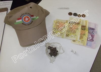 Com Santos, a PM encontrou duas pedras de crack e aproximadamente R$ 65,00 em dinheiro. Já com o menor, o qual é velho conhecido da PM, tendo sido preso várias vezes pelo mesmo crime, foi encontrada uma bucha contendo certa quantia de maconha.