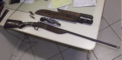 O policial efetuou revistas e encontrou no interior do veículo uma espingarda calibre 36, com duas munições deflagradas, um revólver calibre 38 com cinco munições intactas, dois facões e cerca de R$ 900 em dinheiro.