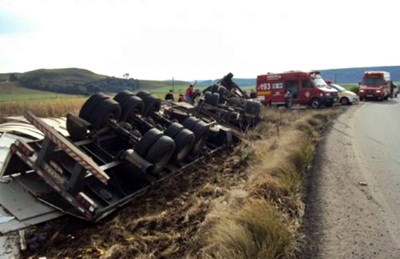 Uma carreta carregada de chapas de MDF que seguia sentido BR-153 saiu da pista e tombou. O veículo tinha placas de Caçador.