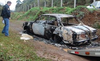 Depois que a guarnição havia registrado o boletim de ocorrência, já por volta das 9hrs, a Central de Operações da PM recebeu a ligação de um popular que informava ter avistado um carro todo queimado ás margens da Rodovia Municipal José Rossi Adami. Indo averiguar, a mesma guarnição da PM constatou que se tratava do Chevette furtado.