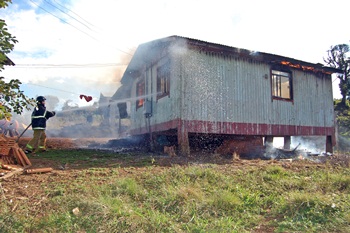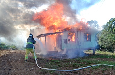 Uma casa de aproximadamente 48 m², foi totalmente destruída em um incêndio na tarde desta quinta-feira, 4 de julho, no Assentamento Hermínio Gonçalves, interior de Caçador. Felizmente ninguém se feriu, já que a residência estava desabitada e era utilizada apenas como depósito de materiais e utensílios do proprietário do imóvel.