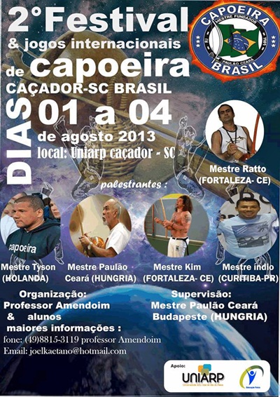 Acontece entre os dias 1º e 4 de Agosto o 2°Festival de Jogos Internacionais de Capoeira em Caçador. O evento tem a parceria com a Uniarp Caçador através do Curso de Educação Física e será realizado na Arena Uniarp com a participação do Mestre Paulão Ceara e