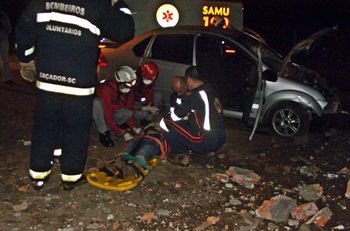 Um acidente de trânsito na noite deste domingo, 4 de agosto na Rua Antônio Bombassaro, no Bairro Martello feriu gravemente uma mulher de 50 anos. Ercílio Universo Tibes, 43 anos, conduzia um Ford Fiesta com placas de Caçador no sentido Corfio/Maxiplast quando perdeu o controle ao passar em uma lombada e bateu forte contra um muro.