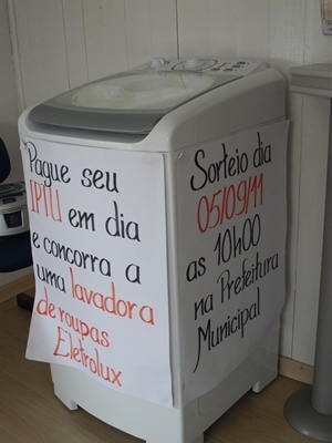 Os recursos são importantes para o Município e irão alavancar avanços em diversos segmentos. A Administração Municipal estará sorteando uma máquina de lavar roupa, 8kg da marca Brastemp, aos contribuintes em dia com suas obrigações tributárias. O sorteio acontecerá às 10 horas e qualquer cidadão pode participar do ato.