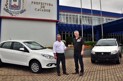 A Prefeitura de Caçador recebeu nesta terça-feira (22) através do secretário da Fazenda, Gilberto Haudsch, as chaves de dois novos veículos, um Siena destinado a Secretaria de Administração, e uma Strada para a Infraestrutura. Os dois carros totalizam um investimento de R$ 93,6 mil, adquiridos pela administração municipal com recursos provenientes do leilão de veículos e maquinários realizado há alguns meses.