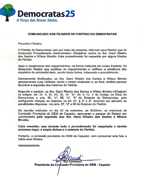 Reunião de comissão especial do Partido dos Democratas, na manhã desta sexta-feira, 02, decidiu pela expulsão dos vereadores Darci Ribeiro dos Santos e Wilson Luis Binotto. A comissão foi montada para atender pedido de várias filiados do partido depois da suposta votação dos dois vereadores no então candidato á prefeito Imar Rocha, na eleição indireta em 20 de abril deste ano. Na época o Democratas mantinha candidata a vice-prefeita em outra coligação.