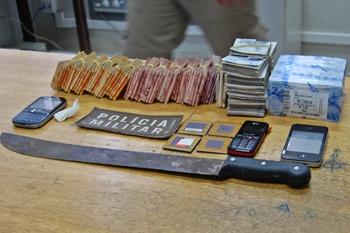 Tendo adentrado ao porão da residência onde eles estavam escondidos, a PM deu voz de prisão aos supostos ladrões e, efetuando buscas no interior da moradia, encontraram no chão as tocas utilizadas para cometer o crime e todo o dinheiro que eles teriam surrupiado. O facão usado para render as vítimas, também foi localizado escondido do lado de fora da casa.