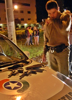 Percebendo a aproximação da PM, o condutor do Uno tentou fugir em alta velocidade, mas próximo a Floricultura Ki Flor acabou perdendo o controle da direção e colidindo num poste e depois na traseira de um veículo que estava estacionado. A guarnição da PM que efetuava a perseguição chegou imediatamente ao local, deu voz de prisão aos indivíduos e apreendeu as armas por eles utilizadas.