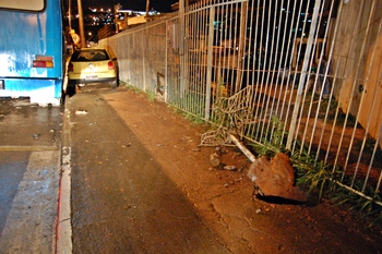 Mesmo parecendo improvável, e para a sorte dos ocupantes, o carro não chegou a bater no ônibus. Ele só parou quando colidiu em uma placa de sinalização que ficava próxima há um poste, caso contrário, possivelmente teria atravessado para o outro lado.