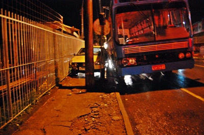 Um acidente de trânsito na noite desta quinta-feira, 28 de novembro, despertou a curiosidade de moradores e pessoas que passavam pela Rua Henriqueta Tedesco, no Bairro Berger. Um veículo Gol placas de Caçador, que descia a via ficou descontrolado e depois de subir na calçada e derrubar uma lixeira, acabou parando num estreito espaço entre a cerca de uma residência e um ônibus que estava estacionado ás margens da rua.