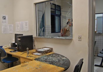 De repente, mesmo algemado e sem que ninguém esperasse, Trancoso se levantou da cadeira onde estava sentado e se jogou de cabeça numa vidraça que divide uma das salas da delegacia, se ferindo e causando prejuízo àquela repartição pública. Para evitar que ele se machucasse gravemente, os policiais precisaram contê-lo e fechá-lo numa cela.